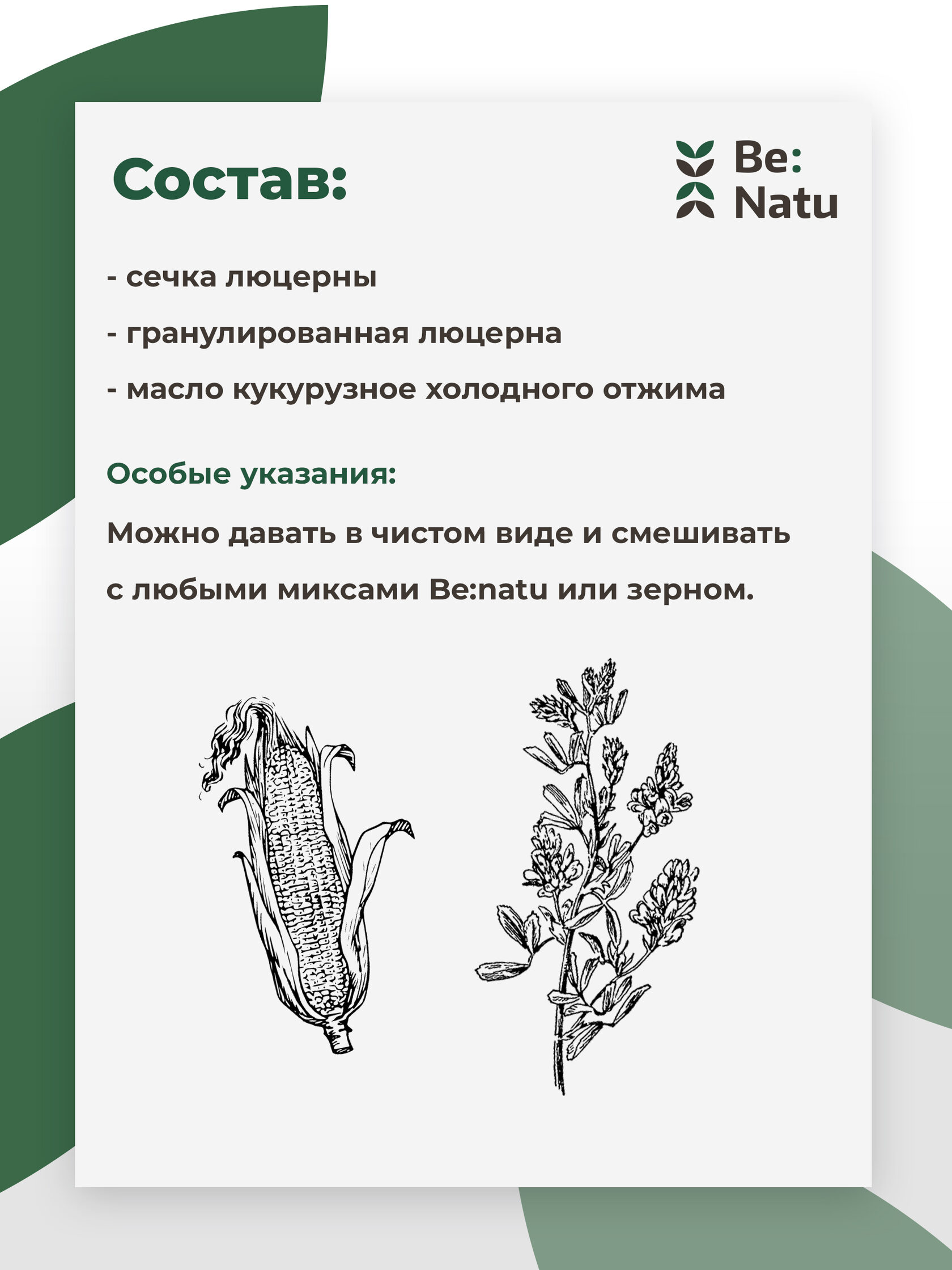 Состав: Сечка люцерны, гранулированная люцерна, масло кукурузное холодного отжима.