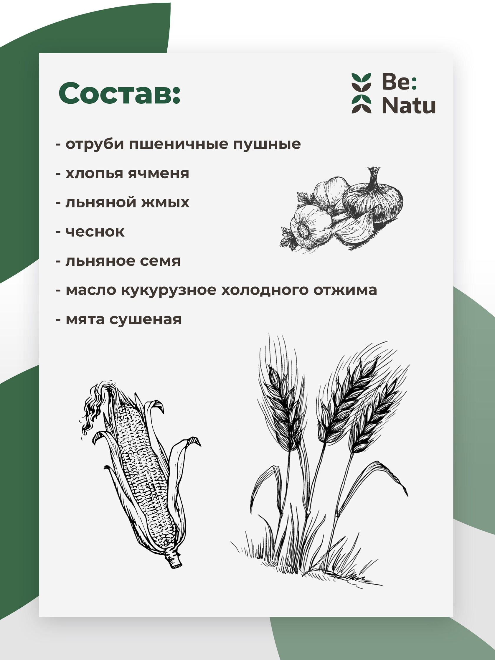 Состав: Отруби пшеничные пушные, хлопья ячменя, льняной жмых, чеснок, льняное семя, масло кукурузное холодного отжима, мята сушеная.