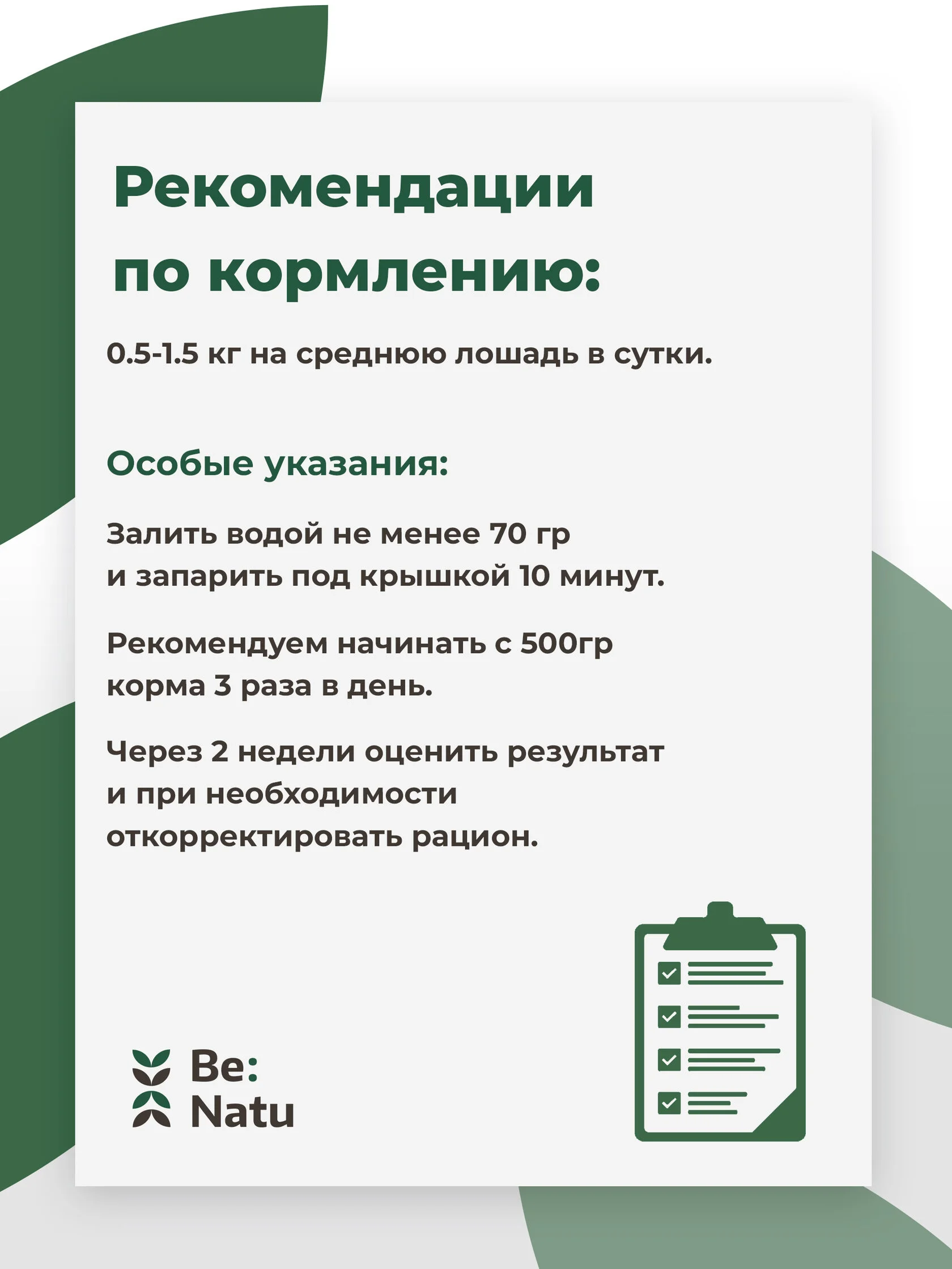 Рекомендации по кормлению: 0,5-1,5 кг на среднюю лошадь в сутки.