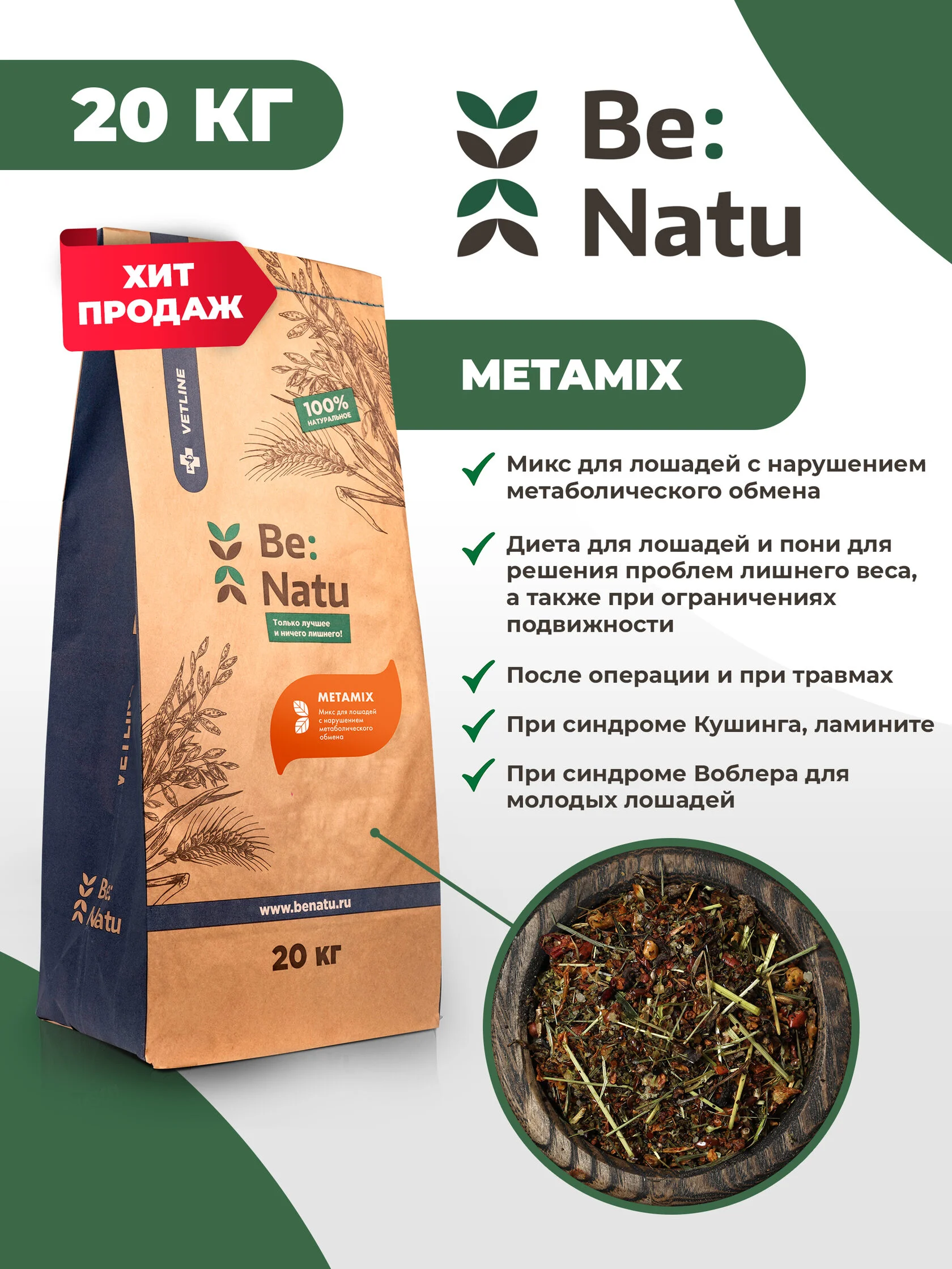 Состав: Сечка травы (с низким гликемическим индексом), яблочные волокна, свекловичные волокна, травяная гранула искусственной сушки, льняное семя, смесь масел холодного отжима (льняное, кукурузное масло), травы (ромашка, укроп, розмарин, кориандр), семена расторопши, семена тыквы, пищевые дрожжи неактивные, соль, карбонат кальция (морской и минеральный), морковь, чеснок, мука из морских водорослей (хлорелла, спирулина).