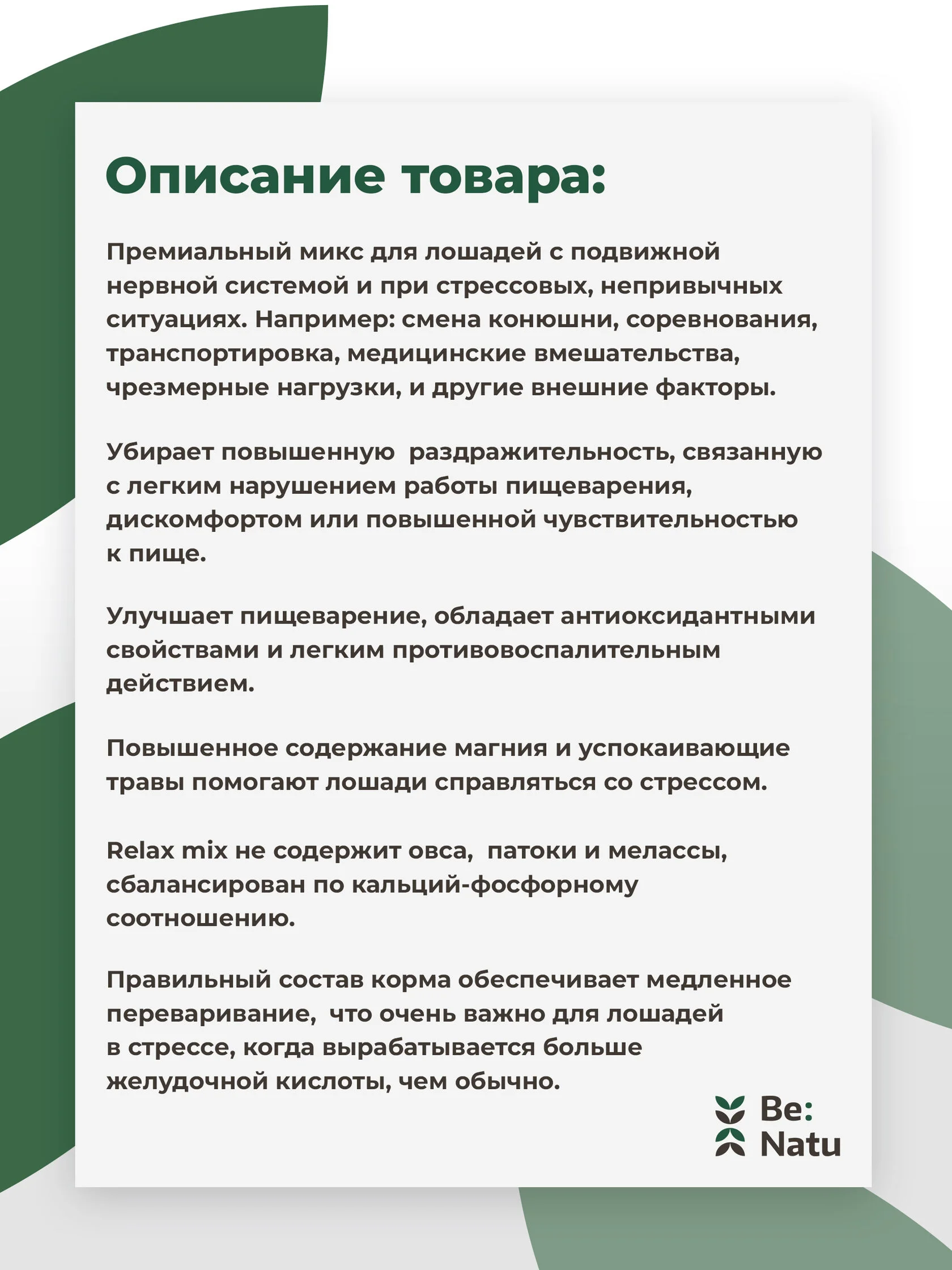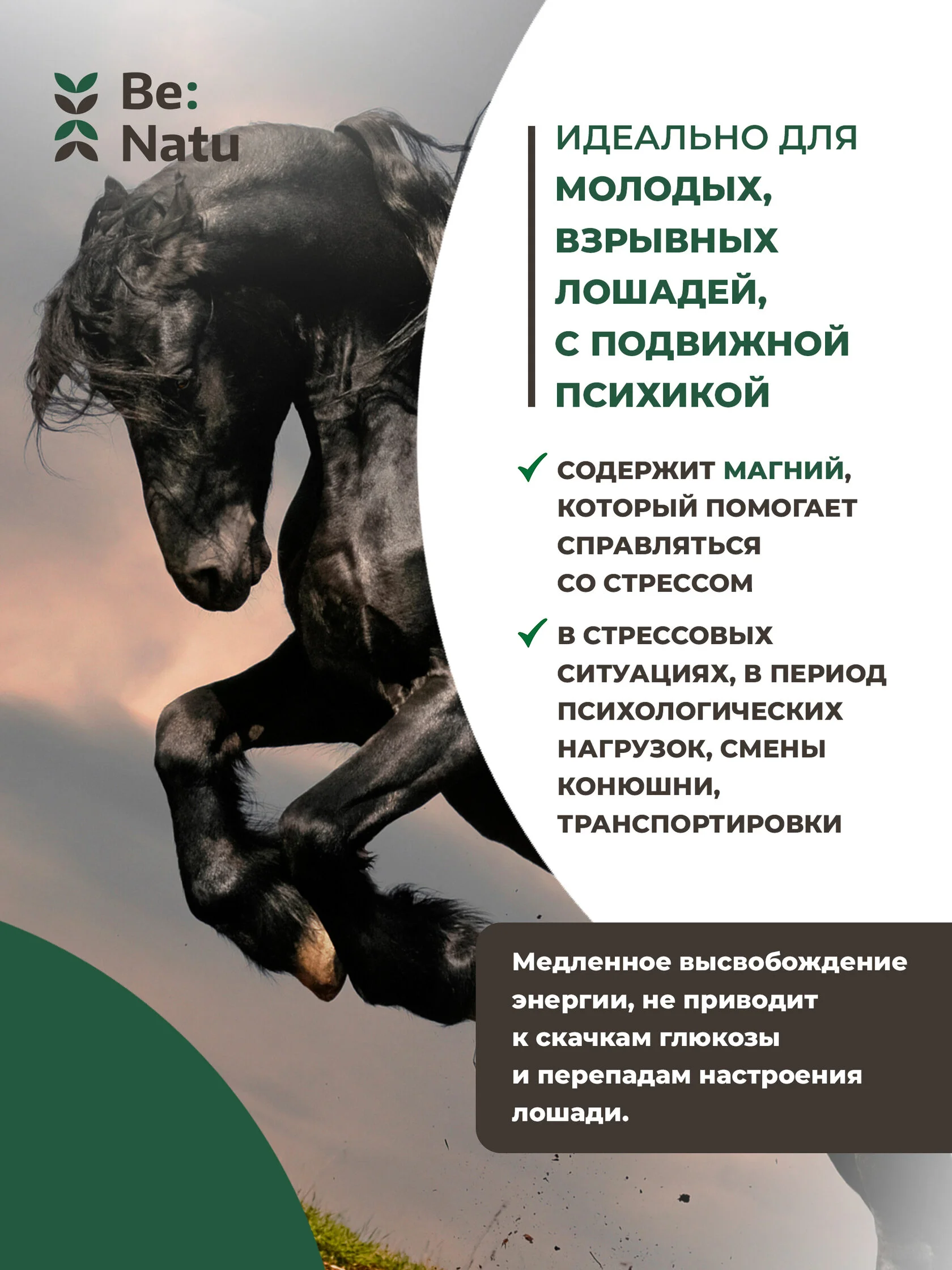 Микс специально разработан для легковозбудимых лошадей, склонных к стрессу. Содержит все питательные компоненты для полноценного и сбалансированного питания. Подходит для лошадей с подвижным типом нервной системы, а также для лошадей, которые сокращают интенсивность тренировок после спортивного сезона.