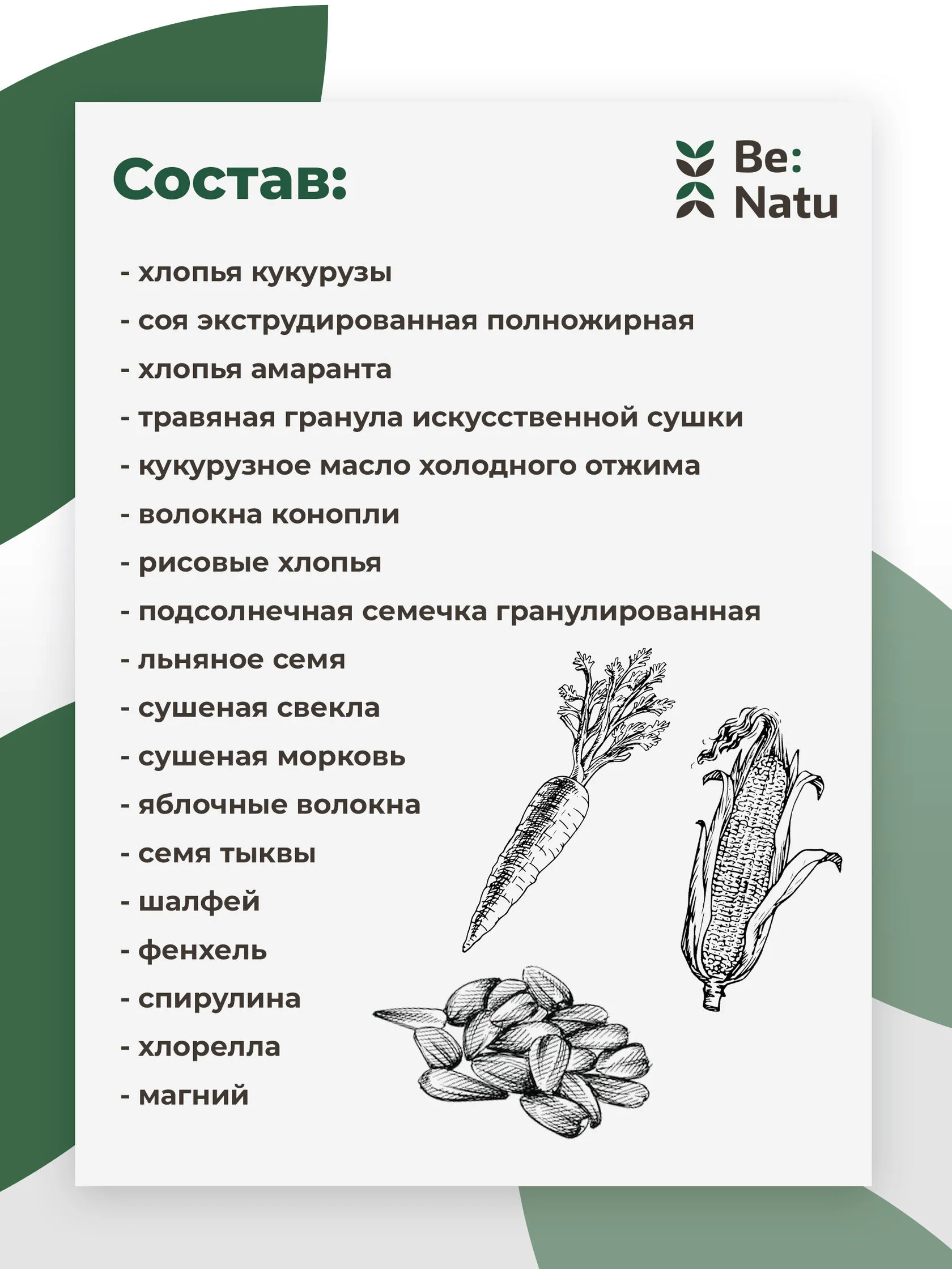 Состав: Хлопья кукурузы, соя экструдированная полножирная, хлопья амаранта, травяная гранула искусственной сушки, кукурузное масло холодного отжима, волокна конопли, рисовые хлопья, подсолнечная семечка гранулированная, льняное семя, сушеная свекла, сушеная морковь, яблочные волокна, семя тыквы, шалфей, фенхель, спирулина, хлорелла, магний.