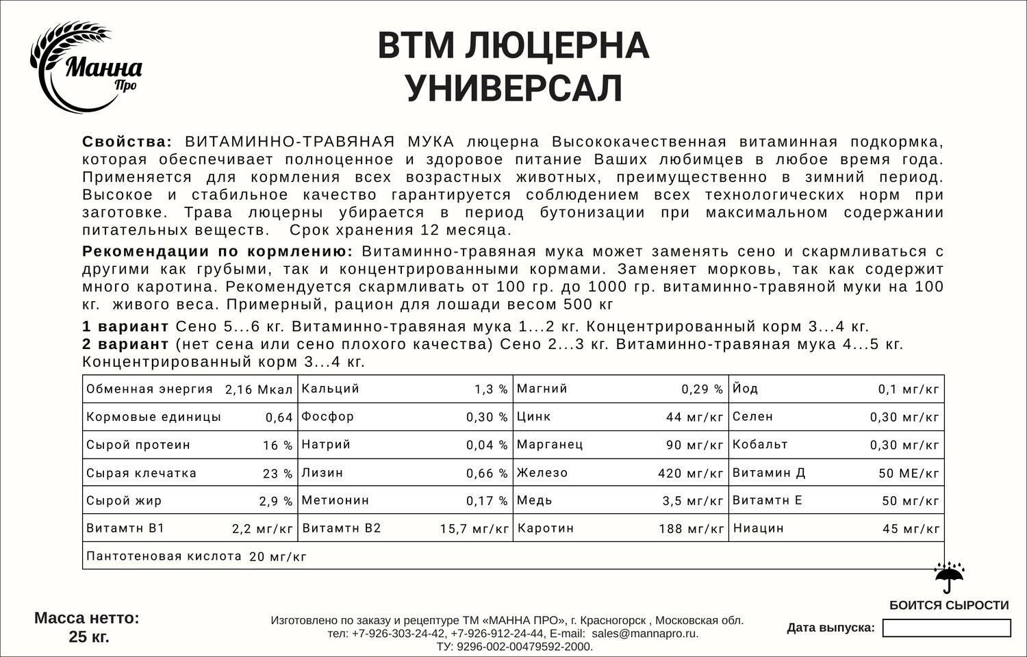 Свойства: ВИТАМИННО-ТРАВЯНАЯ МУКА люцерна Высококачественная витаминная подкормка, которая обеспечивает полноценное и здоровое питание Ваших любимцев в любое время года. Применяется для кормления всех возрастных животных, преимущественно в зимний период. Высокое и стабильное качество гарантируется соблюдением всех технологических норм при заготовке. Трава люцерны убирается в период бутонизации при максимальном содержании питательных веществ. Срок хранения 12 месяца.